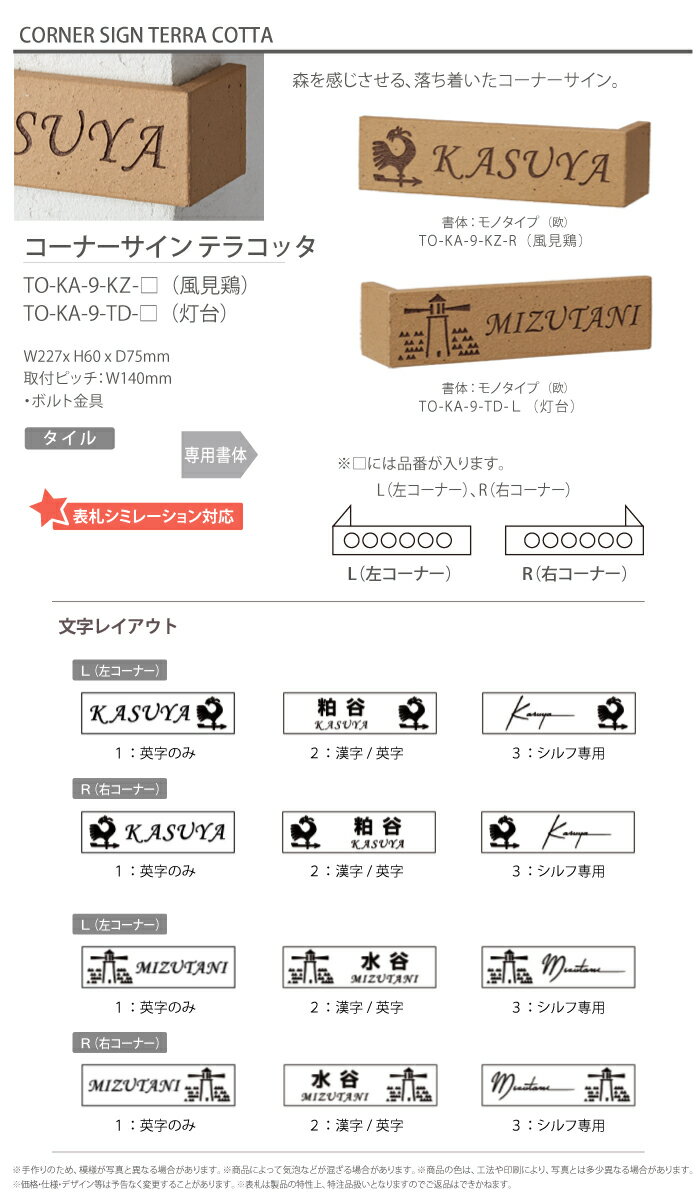 商 品 詳 細商品名【コーナーサイン テラコッタ】TO-KA-9-KZ[風見鶏]サイズW227x H60 x D75mm 取付ピッチ : W140mm材質タイル付属品・ボルト金具ご注文方法[表札シミュレーション]をされた方 ・デザイン/書体などの選択をしないまま、備考欄に発行された[ID/校正番号]を記載ください。