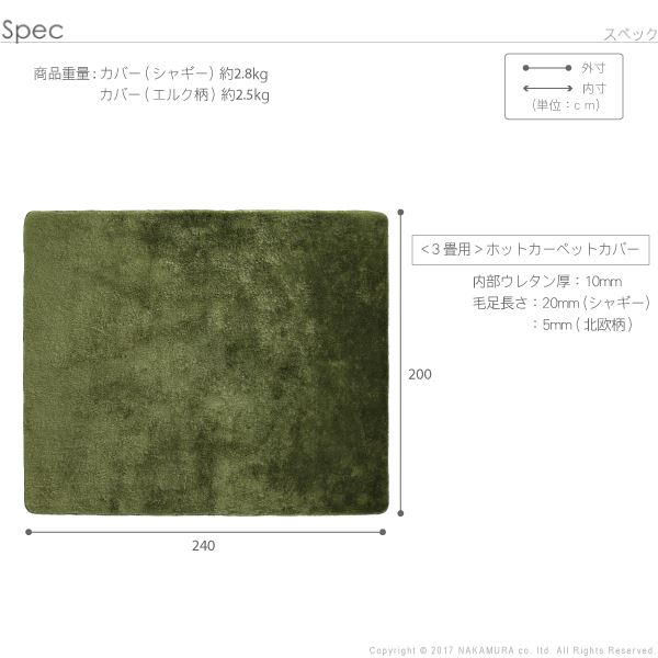 【カラーバリエーション】 ベージュ・オリーブグリーン・アッシュ・ブラウン・エルク_グレー・エルク_グリーン・エルク_ネイビー 【仕様】 表地:ポリエステル100%裏地:ポリエステル100%内部:ウレタン(グレー・グリーン・ネイビーは撥水加工)アルミシート付き 【サイズ】 240x200cm重量:約3kg 株式会社ナカムラ(21101632)お届け営業日16時までにご注文・入金確認で1〜3営業日以内に出荷※土、日、祝日は出荷業務をお休みしております。
