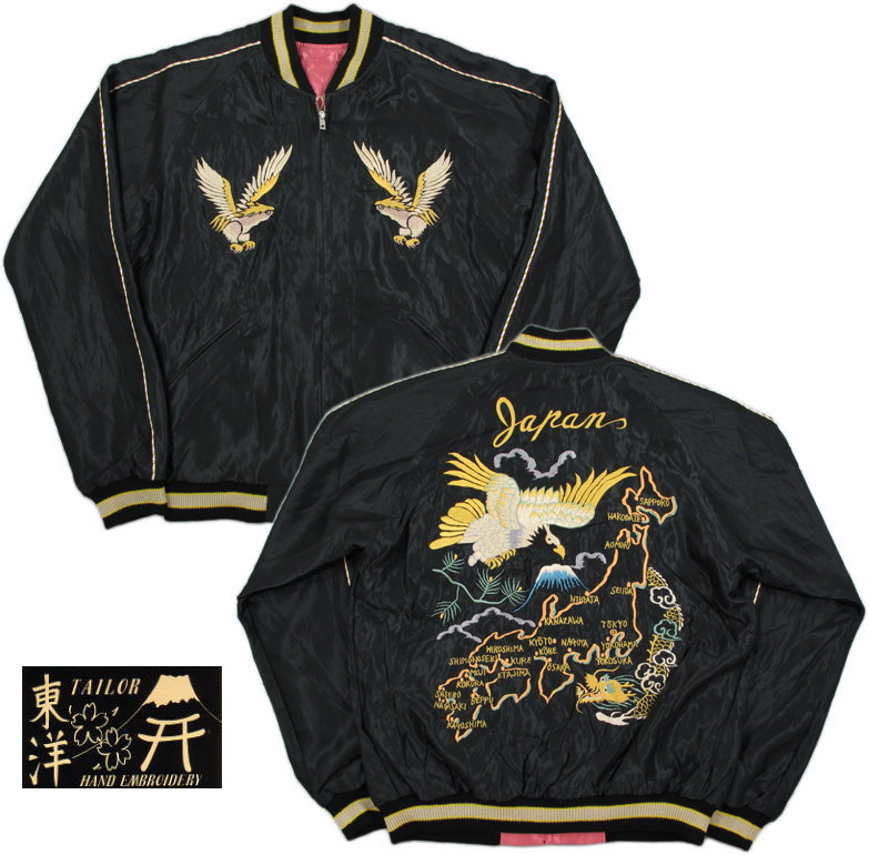 艶々ブラックのアセテート生地に、鷲と龍の入った ジャパンマップを刺繍した表面。